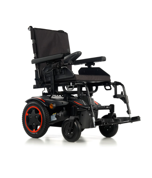 La silla de ruedas eléctrica Q100 R presenta un diseño sofisticado de la base y de las ruedas delanteras y traseras en color negro mate. Sus curvas