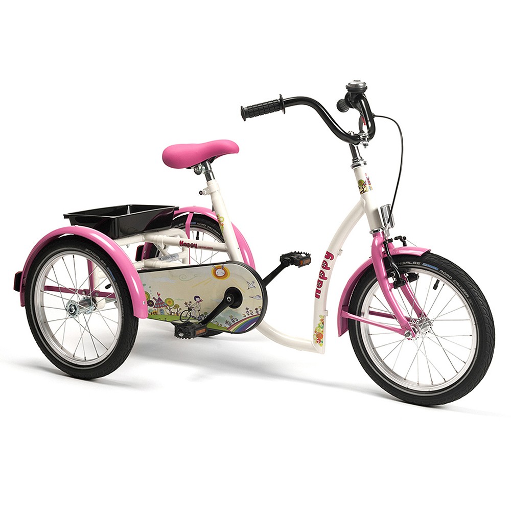 De colores rosados combinado con blanco y una bandeja trasera, ideal para transportar juguetes. El manillar (diferentes modelos disponibles) es ajustable en altura y ángulo para hacer de este triciclo un ajuste perfecto a las necesidades de su hijo